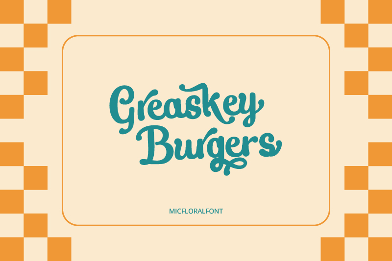 Micfloral presents an expressive script character with dynamic line flows that are full of movement, creating a lively and energetic visual impression. The letter structure combines dynamic curves, balanced proportion, and decorative swash variations, creating an overall appealing look. This character helps build identity for burger stall or burger bar branding that is both friendly and easily recognizable. Because of that, Micfloral is effective in creating an iconic and communicative burger brand in various visual promotion media.