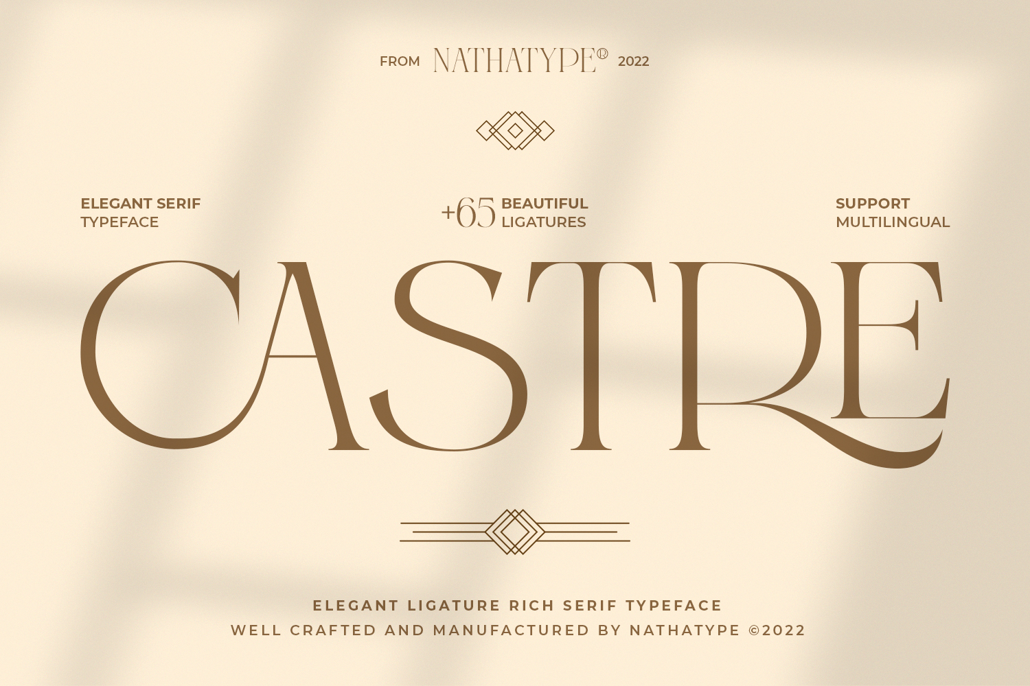 Next, we have Castre. This elegant serif font with an all-caps format looks classy and stylish, making it perfect for contemporary designs. Available in 8 thickness levels, Castre perfectly blends modern serif character with a contemporary look, creating a clean and elegant impression. It provides ligatures that look stunning, as you can see in the letters “C” and “A,” perfectly and harmoniously blended into a curve. Castre is perfect for high-end logos, luxury branding, and exclusive packaging design.