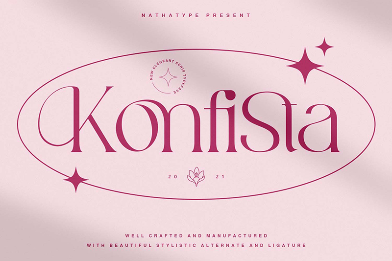 “Formal” and “classy” are two words that aptly describe the elegant serif font Konfista. This font has a sleek, modern, and professional appearance thanks to its well-designed and readable letterforms. Konfista is best suited for branding, product packaging, posters, and social media posts. Don’t worry, if you want some versatility and diversity, this font has swashes, ligatures, stylistic sets, and multilingual compatibility, making any design project or scale easier and more effective.