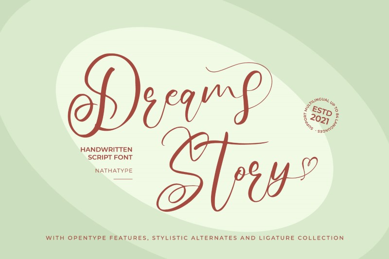 Dreams Story is an enchanting modern wedding font with elegant curves that create a beautiful rhythm. Its strokes add simple elegance, making it suitable for wedding invitations with a touch of gracefulness.